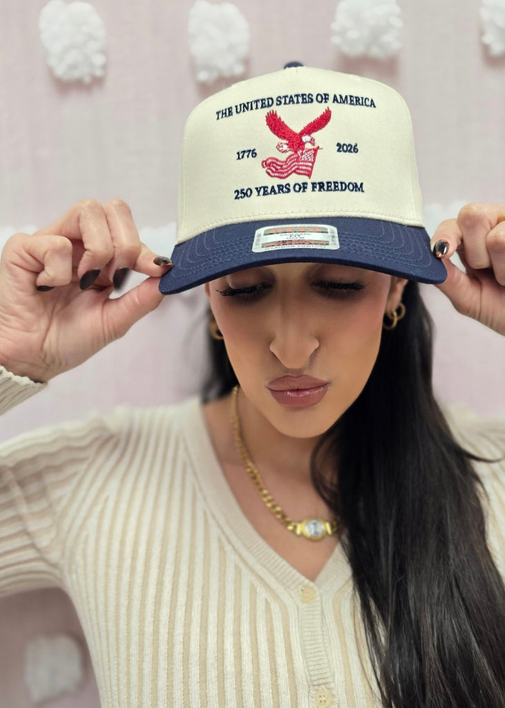 Celebrate a quarter-century of American spirit with this patriotic canvas trucker hat. Featuring bold navy lettering commemorating 250 years of freedom, a striking red eagle and flag graphic, and a contrasting navy bill, this cream-colored trucker delivers vintage charm with contemporary flair. Perfect for road trips, outdoor adventures, or showing your pride year-round. Adjustable fit keeps you comfortable whether you're cruising down the highway or cheering at the ballpark.