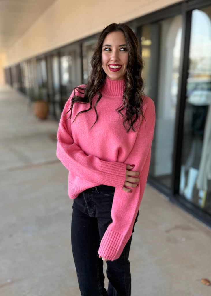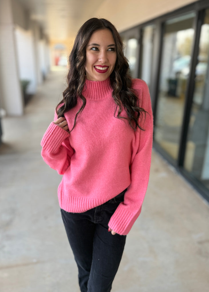 Wrap yourself in effortless comfort with this taffy pink mock neck sweater. Featuring a relaxed fit and drop shoulders for that laid-back vibe, it's the perfect piece for cozy days and casual styling. The long sleeves and high neckline keep you warm while the soft fabric feels like a gentle hug. Whether you're lounging at home or running errands, this sweater pairs with everything and makes getting dressed feel like a breeze.