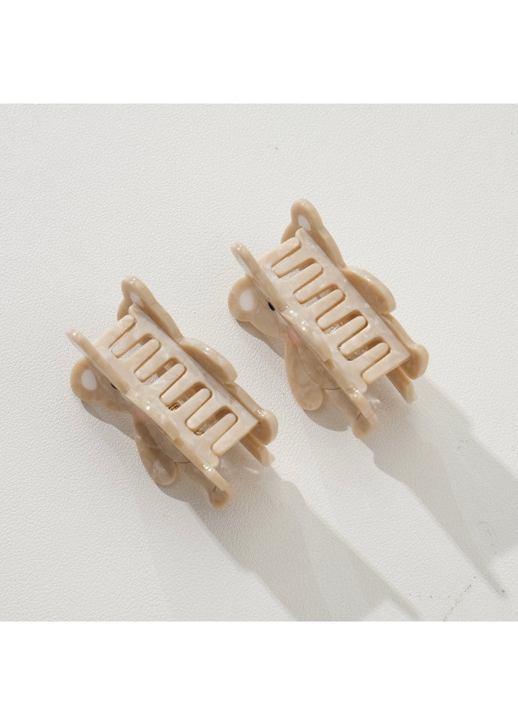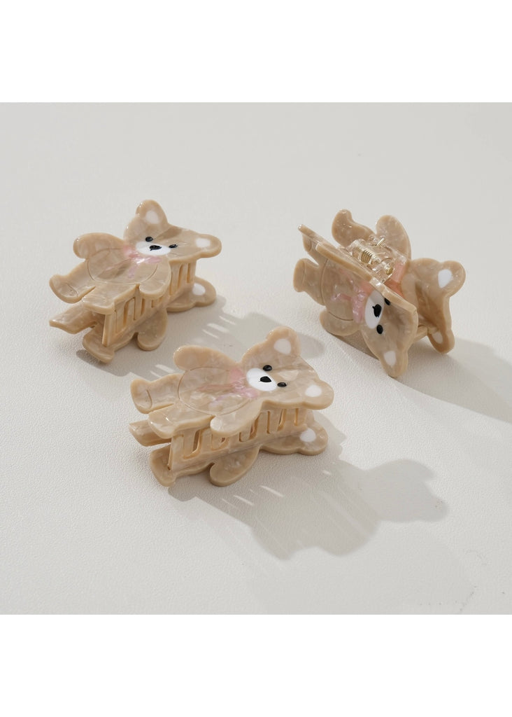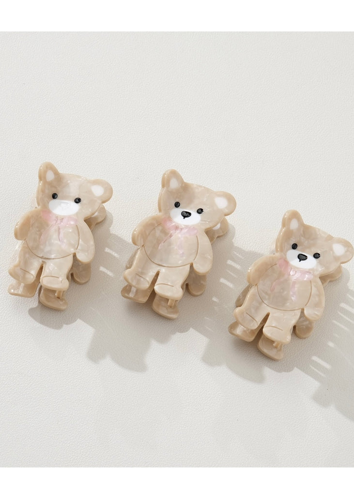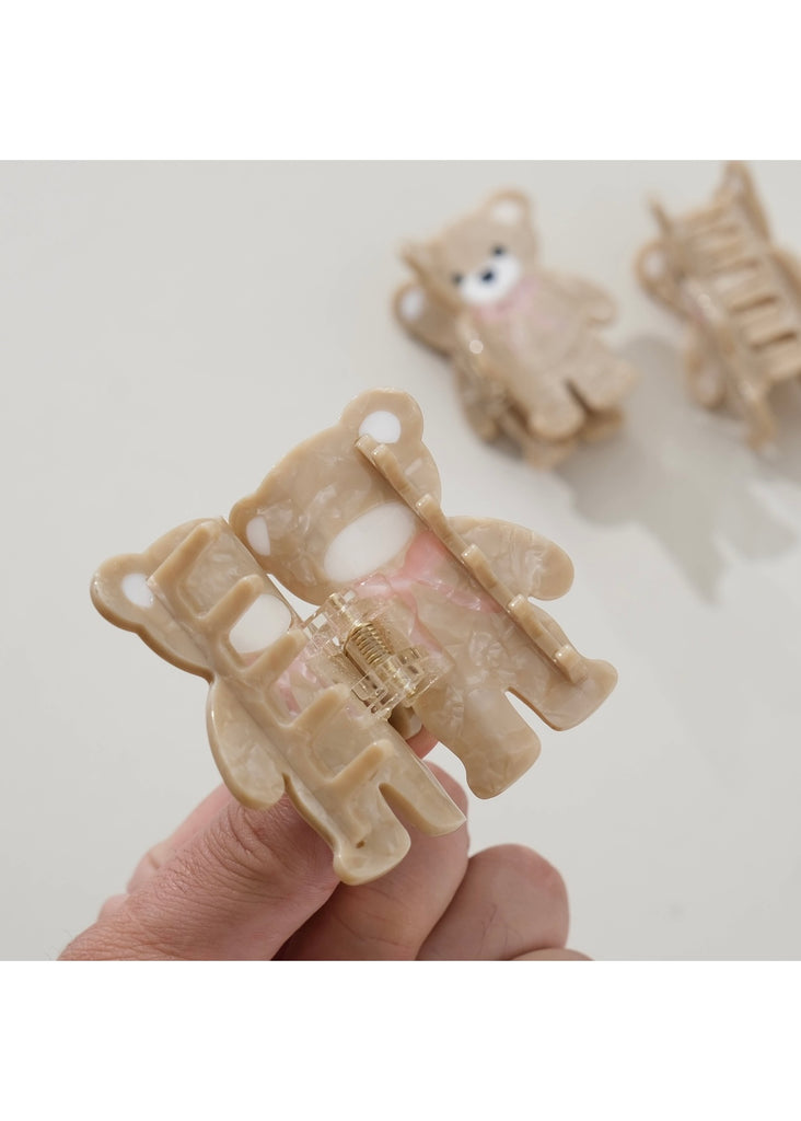 Petite Pink Bow Beige Teddy Bear Claw Clip Small (2.5 inch) Our adorable Teddy Bear claw features a pink bow in a beige color. Made with eco-friendly material that is both durable and comfortable. Measurements: 6cm x 4cm Materials: Cellulose Acetate (eco-friendly material) Cellulose Acetate is a synthetic fiber produced from plant derivatives such as wood pulp and cotton. CA is both durable and biodegradable. Compared to acrylic and PVC materials, you will see that our clips will last you longer. This material has flexible teeth allowing maximum comfort. *Each claw will have slight variations of color and pattern due to how the cellulose plates are cut during our production. *Actual colors may vary slightly from what appears online due to lighting and differences in monitors.