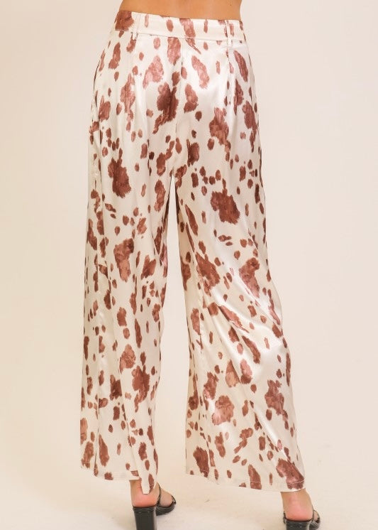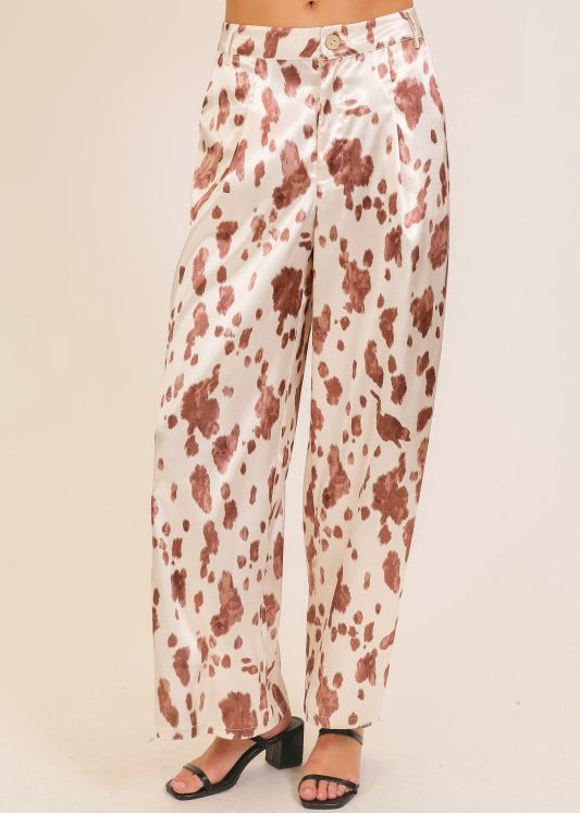 Step into fall with these playful cream pants featuring bold brown cow print accents. Their wide-leg cut offers easy movement and a flattering silhouette, while the smooth satin feel adds a touch of luxe comfort. Practical pockets and a secure zip-and-button closure make them as functional as they are fun. Perfect for turning heads in cozy-chic style this season!