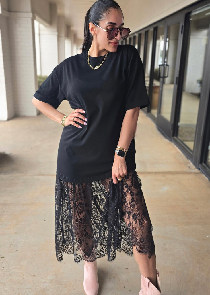The cutest oversized tee dress that gives you effortless style and comfort. Soft black cotton tee with the delicate lace midi skirt adds a touch of feminine charm. Short sleeves keep it casual and breezy, while the relaxed fit lets you move freely—perfect for those days when you want to look put-together without trying too hard. Style it two ways: wear it loose and oversized for that cozy, laid-back vibe, or cinch it with a belt for a more defined, fitted silhouette. Pair with your favorite sneakers for an everyday look or slip on cowgirl boots to elevate your outfit. Versatile, comfortable, and undeniably cute—this dress is your new go-to piece.