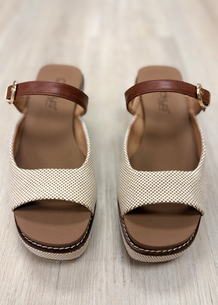 This spring and summer new arrival is a great choice for work-approved outfits, is a structured open-toe slip on shoe with an all-over light beige checkered textured design with a faux leather bourbon adjustable strap elevates this shoe for a more refined, sophisticated look.
