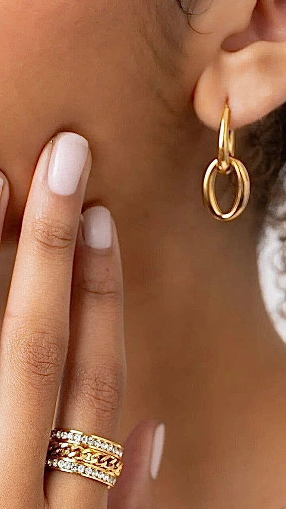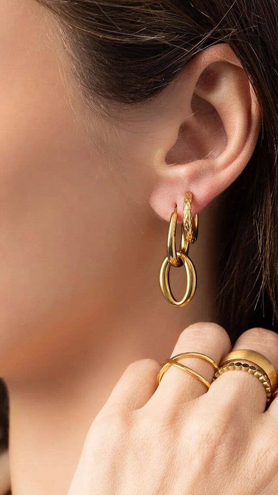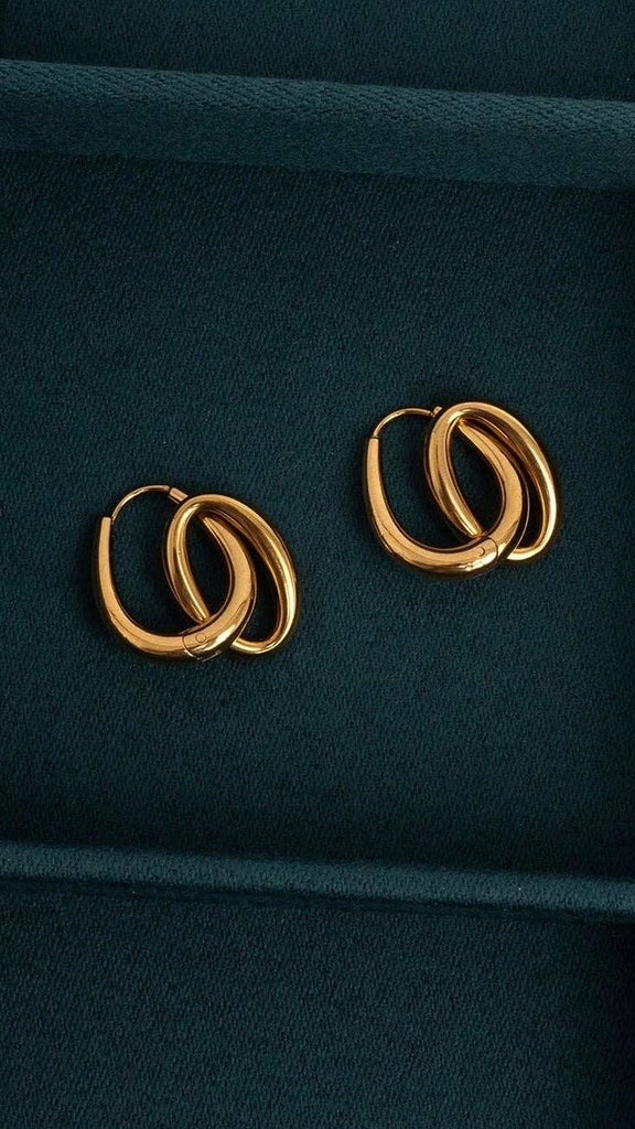 Two hoops. One effortless statement. This 18K Gold PVD stainless steel design features a sleek huggie with a second floating hoop that swings for subtle movement and shine. Water‑resistant, tarnish‑resistant, and lightweight, it’s the easy upgrade for everyday denim or a night out. Wear solo for clean polish or stack with studs and cuffs for a layered look. ✦ Waterproof, Non-tarnish, Hypoallergenic ✦ Quality That Lasts ✦ Designed for All Skin Types ✦ Perfect for Every Budget Size/Dimension: 32mm x 16.60mm ( 1.25" x 0.65" ) Weight: 9.70g Why PVD? We use the process of PVD Coating our 18K Gold jewelry over 316L surgical grade stainless steel for a non-tarnish, hypoallergenic, polished finish that will hold up best to everyday wear and will never turn your customer's skin green.