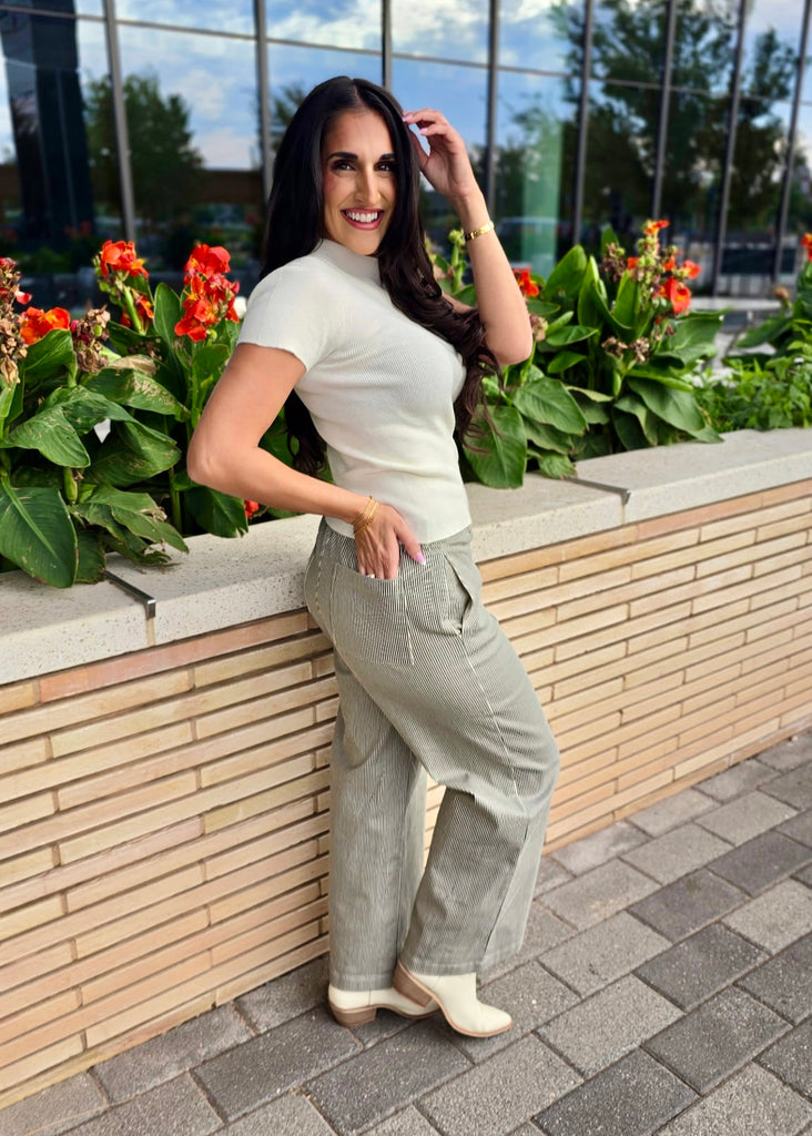 Step into fall with the Good Girl Black & White Striped Pant—your new favorite work-to-weekend essential. These high-waisted, wide-leg pants feature a sleek zip and button front, plus handy pockets in front and back for keeping your essentials close. The bold stripes add a playful twist to classic office style, making it easy to stand out while staying comfortable all day. Perfect for mixing professionalism with fun, these pants are ready to join your seasonal wardrobe rotation.
