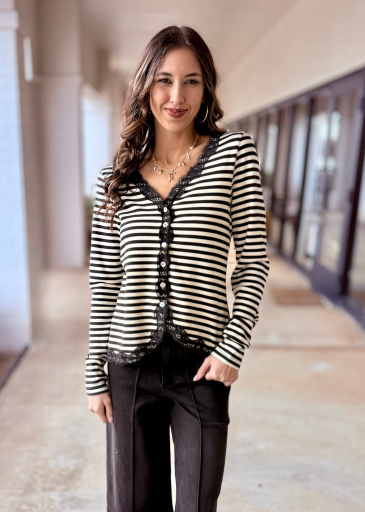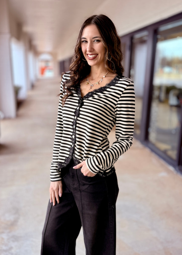 Black and ivory stripes meet sophistication in this knit cardigan that refuses to play it safe. Featuring a flattering V-neckline, button-up front, and long sleeves trimmed with delicate black lace, it's the perfect blend of edgy and elegant. The stretchy, soft knit fabric moves with you all day, making it ideal for layering or wearing solo. Whether you're channeling vintage vibes or modern edge, this striped stunner delivers attitude with every wear.