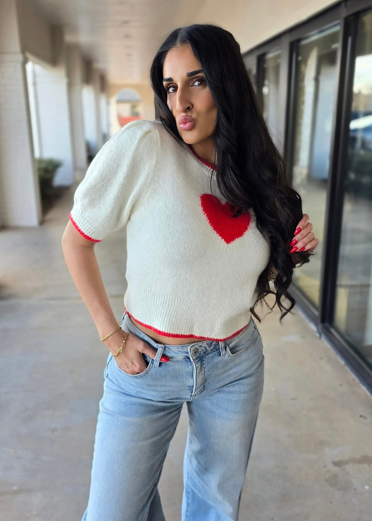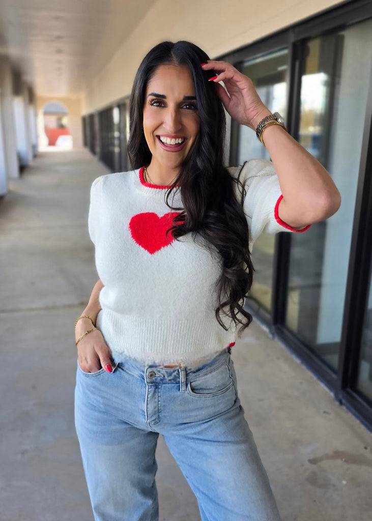 Spread the love in this adorable white sweater featuring a bold red heart front and center. Cozy crew neck, short puff sleeves, and a banded waist with charming red trim create the perfect Valentine's Day look. Crafted from super soft fabric, it's as comfortable as it is cute. Whether you're celebrating love or just embracing your romantic side, this sweater is ready to steal hearts.