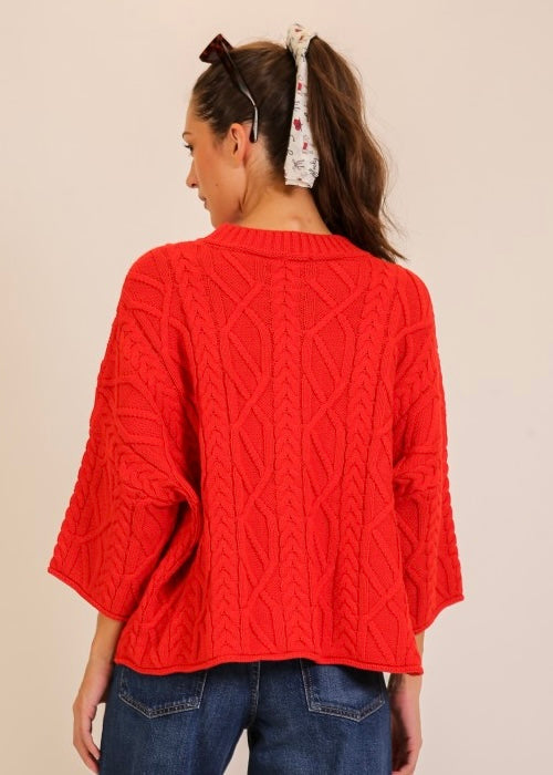 Wrap yourself in cozy comfort with this vibrant red cable knit sweater, perfect for those crisp fall days. The classic crewneck and three-quarter sleeves offer effortless style, while the ultra-soft fabric feels like a warm hug against your skin. Whether you're sipping cider at the pumpkin patch or enjoying a casual weekend, this versatile piece brings both warmth and a pop of color to your seasonal wardrobe.