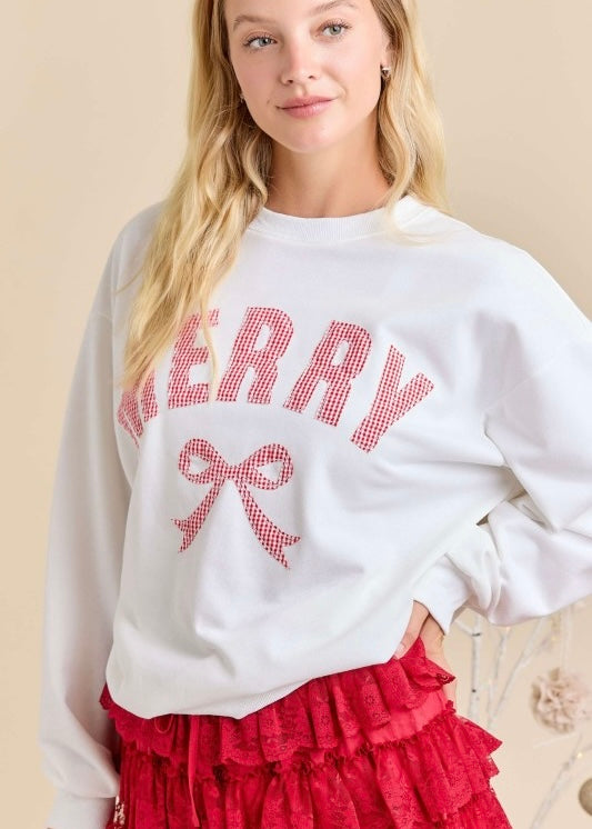 Spread holiday cheer in this cozy white sweatshirt featuring festive red and white gingham patchwork and a charming "Merry" bow patch. The relaxed loose fit and classic crew neck make it perfect for casual comfort, whether you're decorating, gathering with loved ones, or just embracing the season's spirit. A playful piece that brings warmth and whimsy to your everyday rotation.