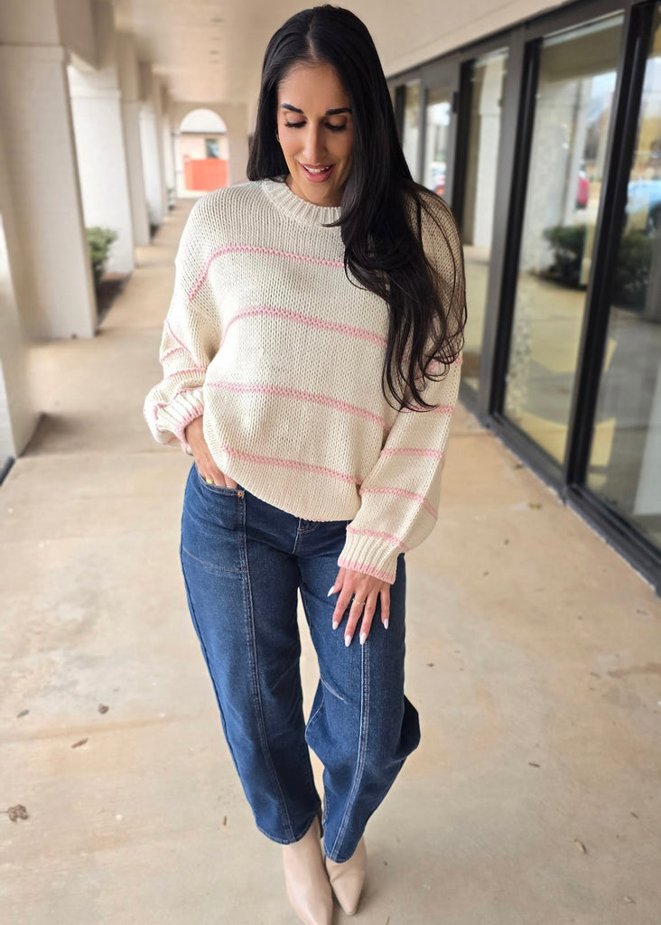 Get ready to turn heads in this delightfully striped sweater! Alternating pink and ivory bands create a fun, eye-catching look that's impossible to resist. The crew neck design keeps things classic while the ultra-soft knit fabric hugs you like a warm hug. Perfect for those days when you want to feel snug and fabulous at the same time. Layer it, style it, love it—this sweater is your new go-to for effortless charm and comfort.