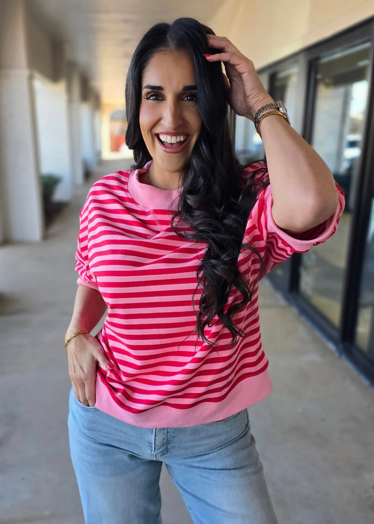 Brighten your downtime in this cheerful striped top that's all about feel-good vibes. The bold red and pink stripes pop against the soft light pink trim at the cuffs and hem, while the mock neck adds a polished touch. Short sleeves keep things breezy, and the relaxed fit makes it perfect for lounging, running errands, or just embracing your comfiest self. Simple, spirited, and oh-so-wearable.