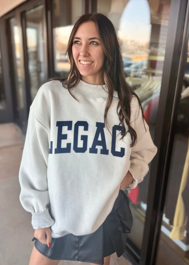 Rock two looks in one cozy piece! This oversized mock neck sweatshirt flips between a bold navy "legacy" graphic and a sleek black "freedom" design, giving you double the style. Crafted in soft grey with a playful inside-out hem detail, it's the perfect oversized fit for maximum comfort. Whether you're channeling bold statements or keeping it chill, this reversible essential delivers versatility with attitude.