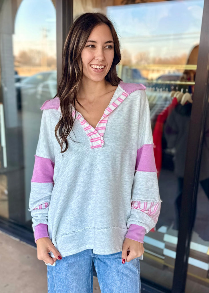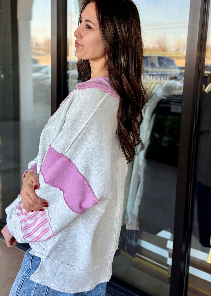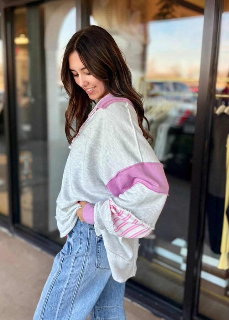 Slip into effortless comfort with this playful color block pullover that's as fun as it is cozy. Crafted from soft French terry, this oversized beauty features a charming mix of crisp white grey, bubble pink stripes, and lavender accents that bring instant personality to your everyday look. The relaxed loose fit, collared neckline, and convenient side slits make it perfect for lounging or casual outings. Whether you're keeping it chill at home or grabbing coffee with friends, this pullover delivers style without the fuss.