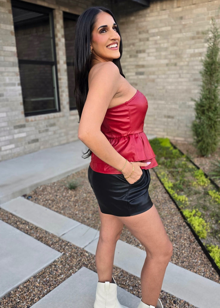 Turn heads on your dinner date night with this playful red faux leather strapless peplum top. Featuring a sleek back zip for a secure fit and a flirty peplum silhouette that highlights your waist, it pairs perfectly with leather shorts for an effortlessly bold, chic look. Embrace confidence and style in this standout piece designed to make your night unforgettable.