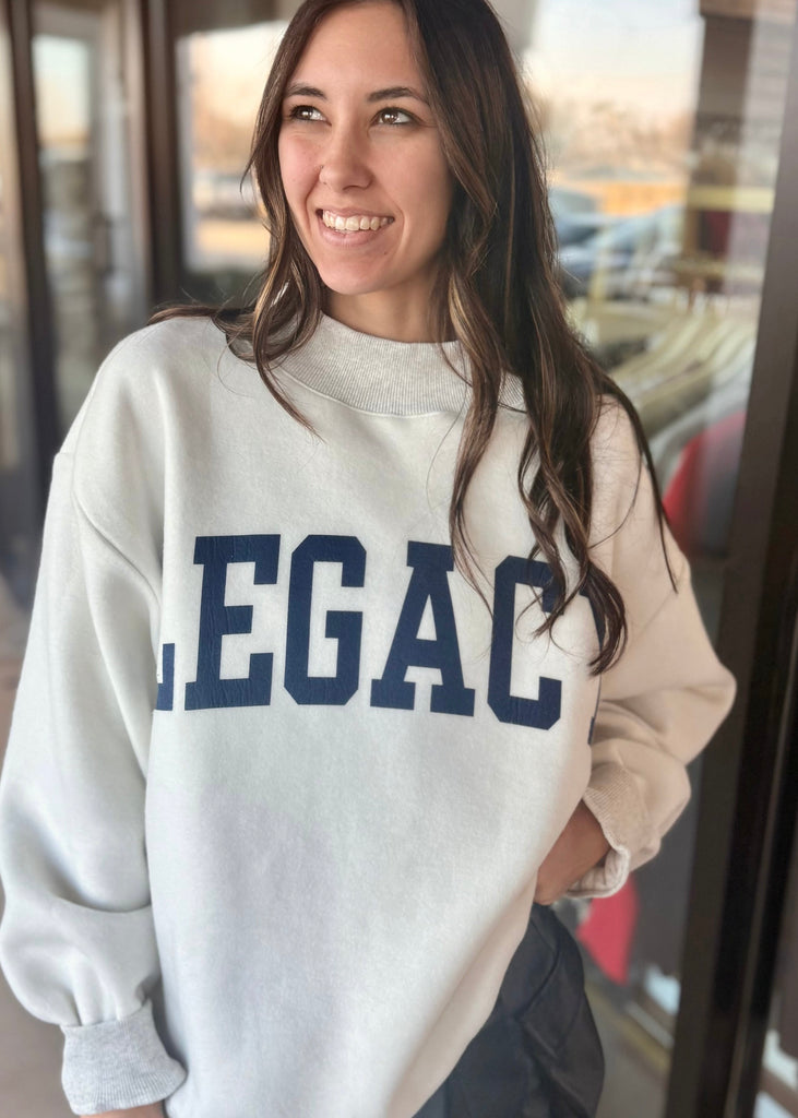 Rock two looks in one cozy piece! This oversized mock neck sweatshirt flips between a bold navy "legacy" graphic and a sleek black "freedom" design, giving you double the style. Crafted in soft grey with a playful inside-out hem detail, it's the perfect oversized fit for maximum comfort. Whether you're channeling bold statements or keeping it chill, this reversible essential delivers versatility with attitude.