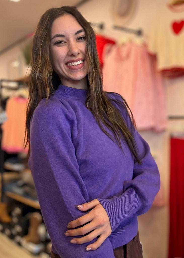 Wrap yourself in cozy vibes with this purple crewneck sweater that's basically a hug you can wear. The super soft fabric feels like a cloud against your skin, while the playful balloon sleeves add just the right amount of personality to your everyday look. Perfect for those days when comfort is absolutely non-negotiable. Layer it, style it solo, or make it your go-to piece for effortless cool.
