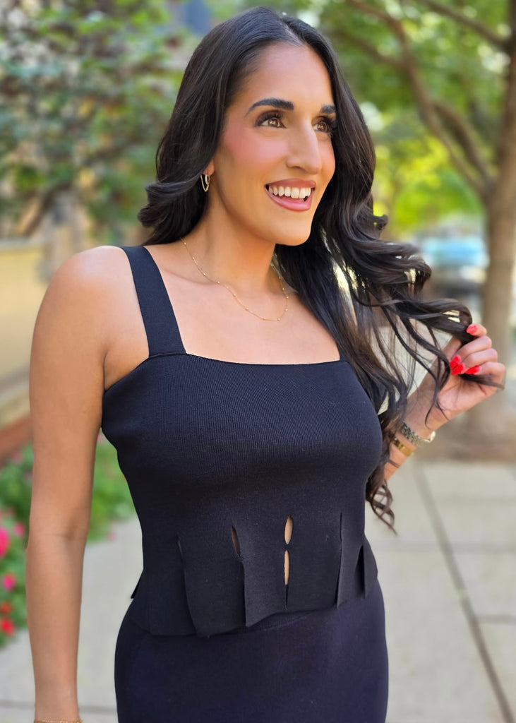 The Just One Look Black Fringe Sweater Tank brings playful vibes with its wide fringe cut detail. Featuring a flattering square neck and cropped fit, this stretchy tank top offers comfort and style in one. Perfect for adding a fun twist to any casual look, it’s a lively piece that moves with you.