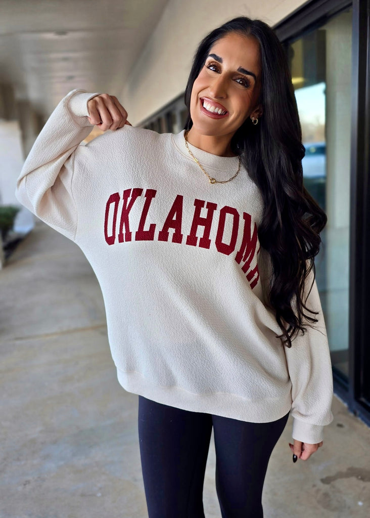 Embrace your Sooner spirit in this dreamy cream knit top! Featuring bold crimson "Oklahoma" lettering across the chest, it's the perfect lightweight layer for those in-between weather days. The soft, breathable fabric makes it ideal for transitioning into spring while keeping you cozy and stylish. Whether you're cheering from the stands or just showing your pride, this graphic tee delivers comfort with personality. A versatile essential that pairs effortlessly with your favorite jeans or skirts.