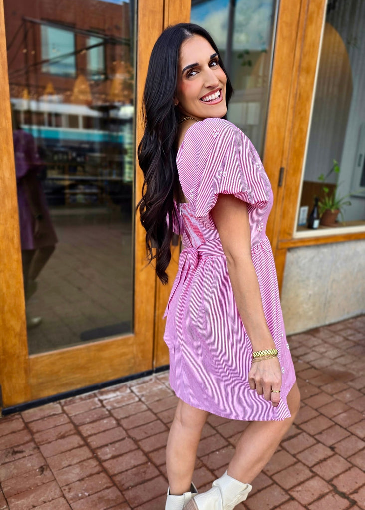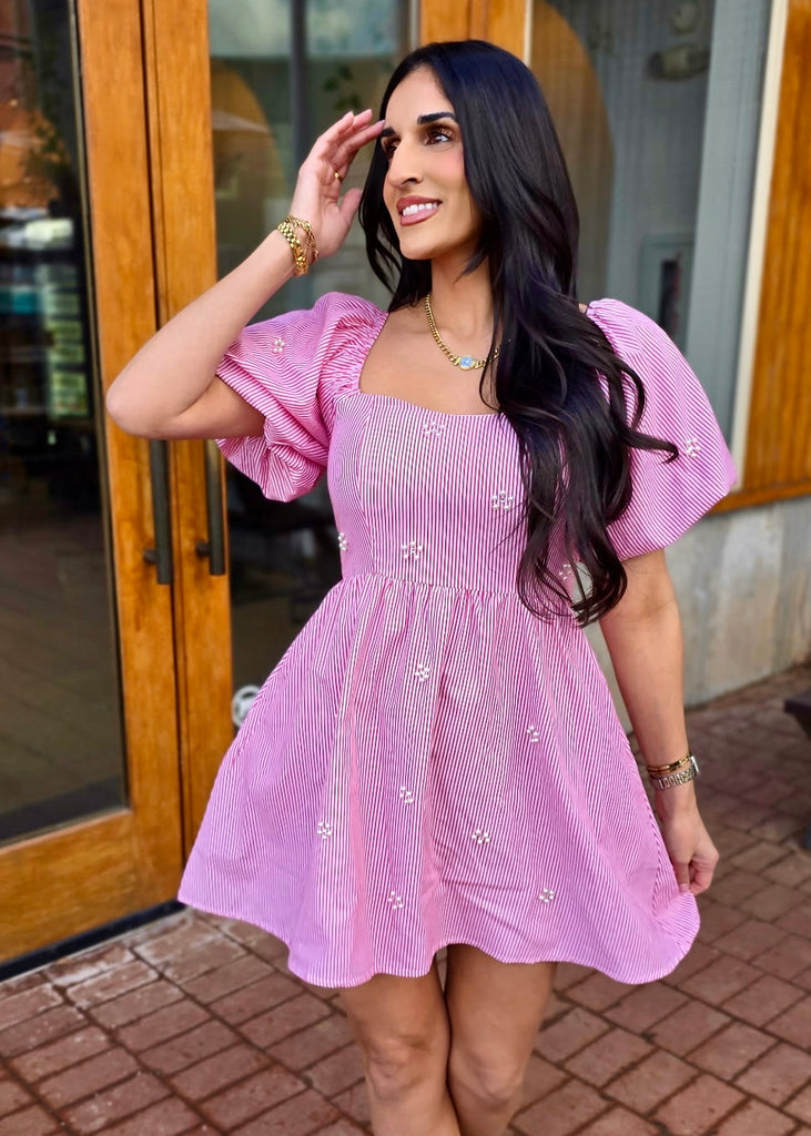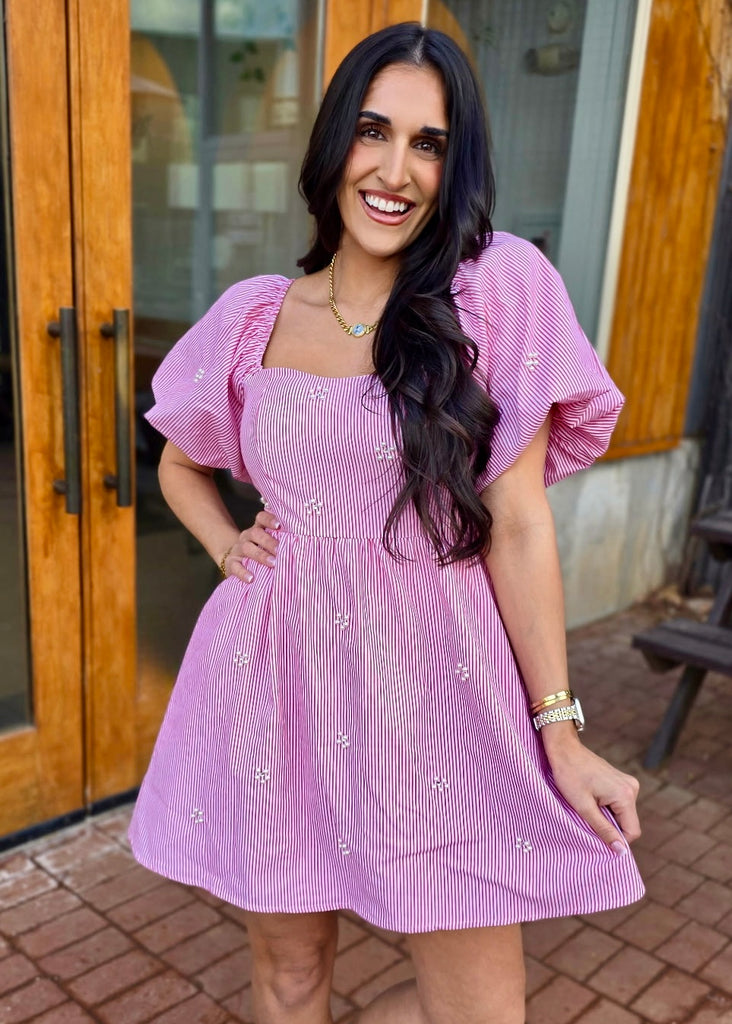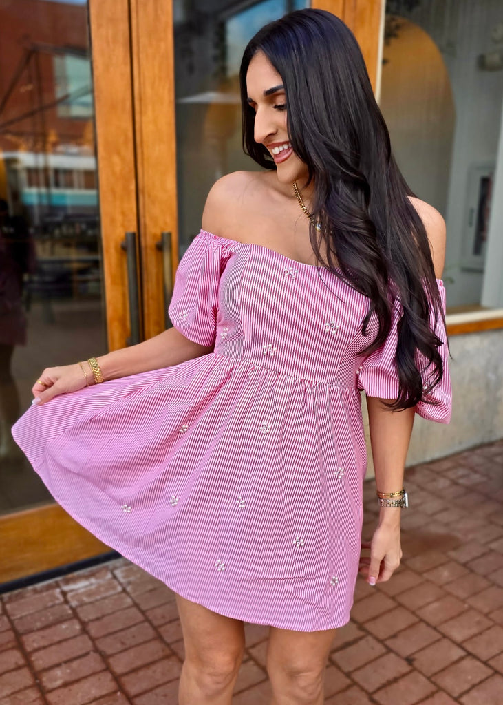 Ain't she sweet in this charming red and white striped mini dress! Delicate pearl patterns scatter across the fabric for a touch of sparkle, while bubble sleeves add playful dimension—wear them off-the-shoulder for an extra flirty vibe. The back zip closure keeps things sleek, and self-tie details let you cinch the waist just right. Fully lined for comfort and confidence, this dress is your go-to for turning heads at any occasion.