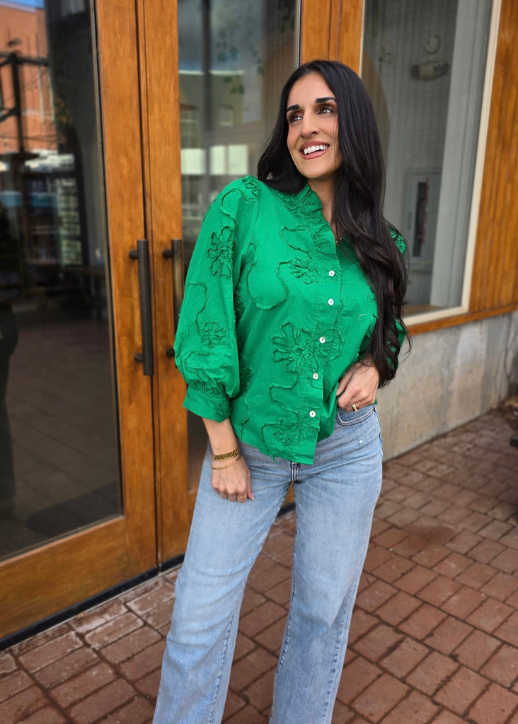 Elevate your everyday style with this adorable green patterned button-up top that's equal parts chic and fun. The ruffled collar adds a flirty touch, while the front buttons let you customize your look. Three-quarter sleeves strike the perfect balance between cozy and sophisticated. Whether you're heading to brunch or a night out, this modern essential pairs beautifully with everything in your closet. It's the kind of piece that makes you feel confident and fabulous.