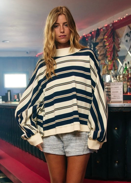 Throw on this oversized mock neck top and embrace effortless spring style. Crafted in a lightweight fabric that won't weigh you down, it features charming cream, navy, and grey stripes that work with practically everything in your closet. The relaxed fit makes it perfect for layering or wearing solo—your new go-to piece for those in-between weather days. Casual comfort meets intentional design.