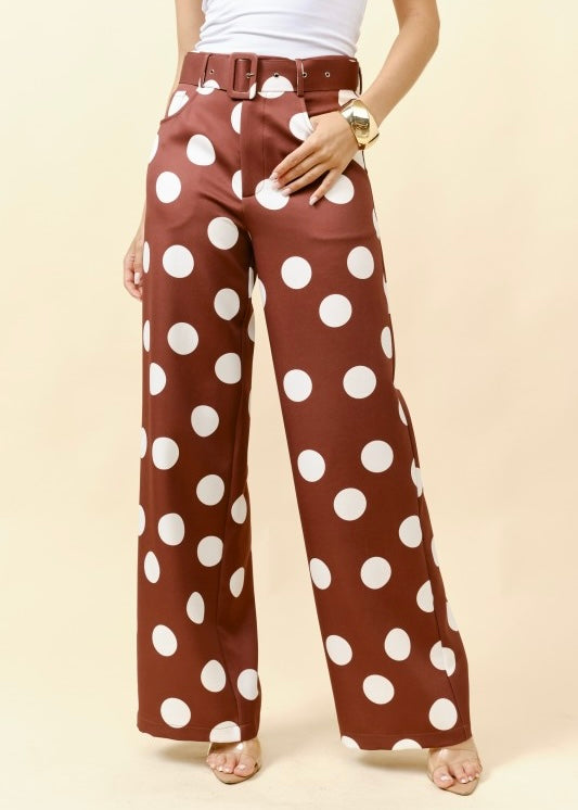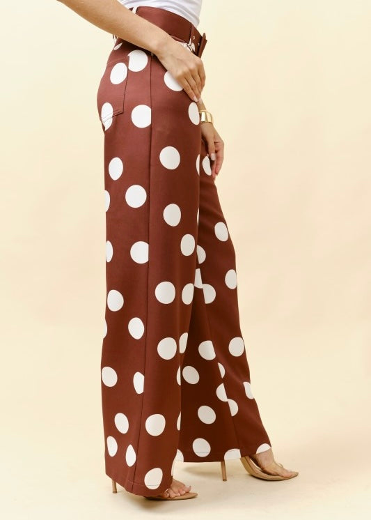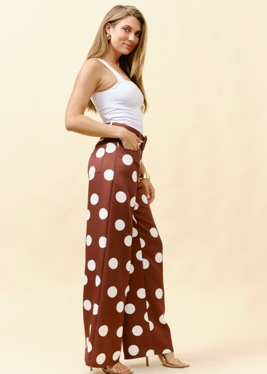 Make a statement with these Chocolate Drop Polka Dot Pants! Featuring bold white polka dots against rich brown fabric, these trendy bottoms combine style with practicality. Dual pockets keep your essentials close, while the secure zip and button closure ensures a perfect fit every time. The matching fabric belt adds a coordinated finishing touch. Whether you're dressing up or keeping it casual, these eye-catching pants bring fun and personality to any outfit.