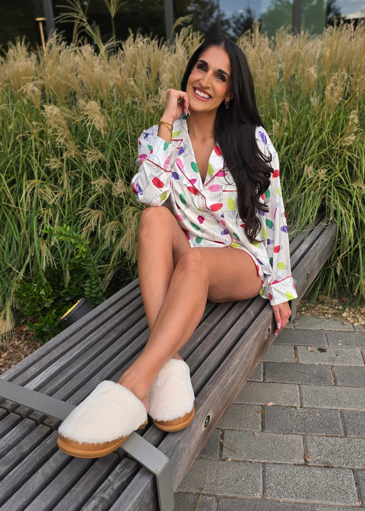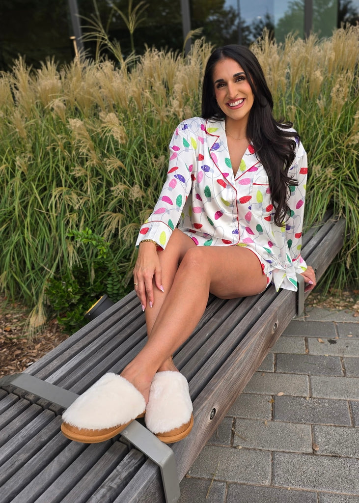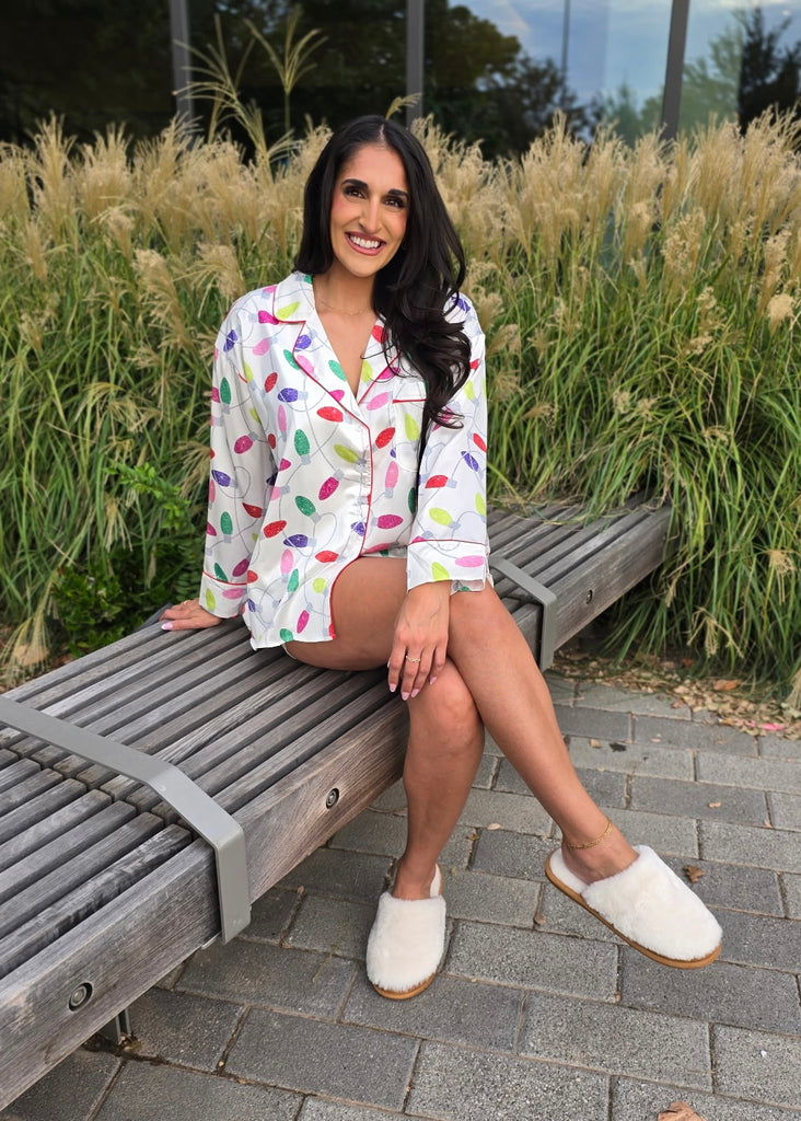 Light up your cozy nights with this playful 2-piece Christmas Lights PJ set. The off-white satin long-sleeve button-up top features a classic collar and festive multicolor lights design, adding holiday cheer to bedtime. Paired with loose-fit shorts that have an elastic waist and handy side pockets, this set offers comfort and convenience for lounging in style. Perfect for festive mornings or relaxed evenings, these pajamas bring joyful sparkle to your holiday routine.