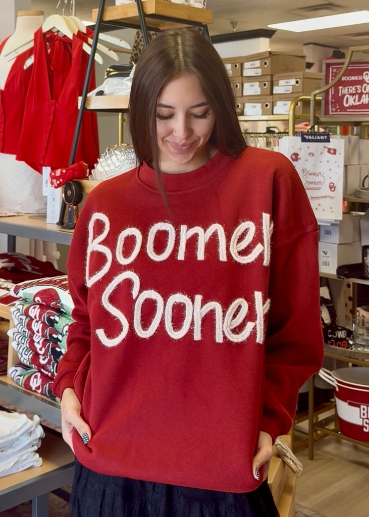 Show your team spirit in style with the Crimson "Boomer Sooner" Metallic Stitched Fleece Sweatshirt. This cozy sweatshirt features eye-catching metallic stitching that highlights your pride in a fun and bold way. Perfect for staying warm while cheering on your favorite team or adding a pop of color to your casual outfit. It’s comfy, vibrant, and ready to help you shout “Boomer Sooner!” wherever you go.