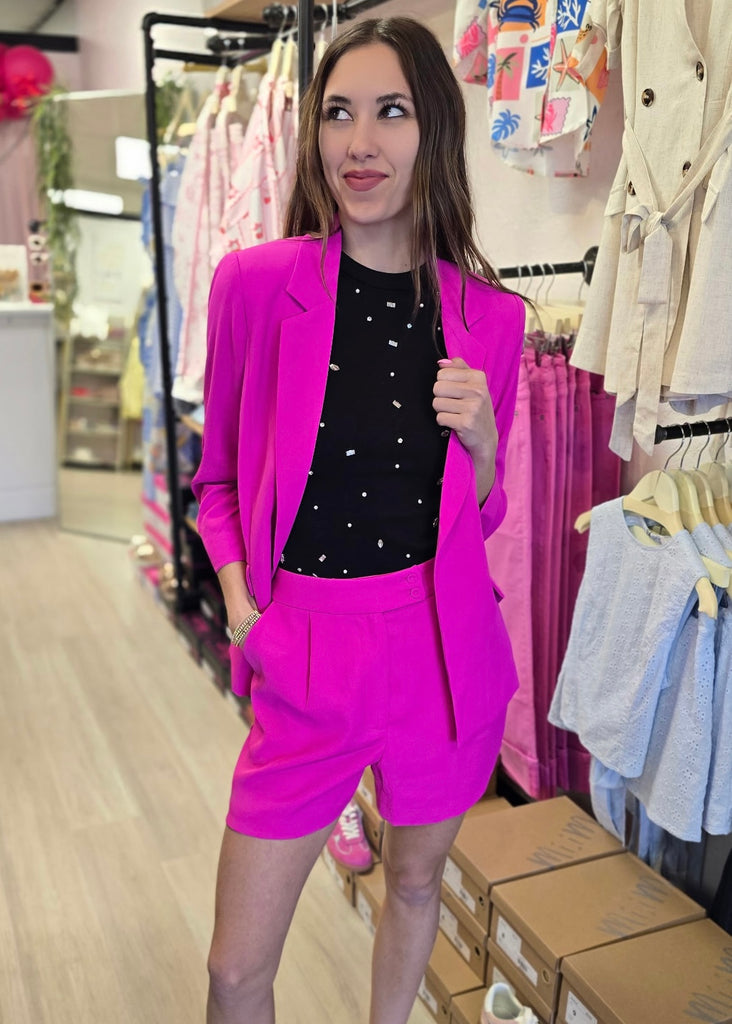 Elevate your wardrobe with these stunning hot pink tailored shorts that combine style with comfort. Crafted from super soft fabric, they feature a polished button and zip closure, functional pockets, and a flattering fit that works beautifully on its own or paired with the matching blazer for a complete, sophisticated look. Perfect for anyone ready to make a confident fashion statement.