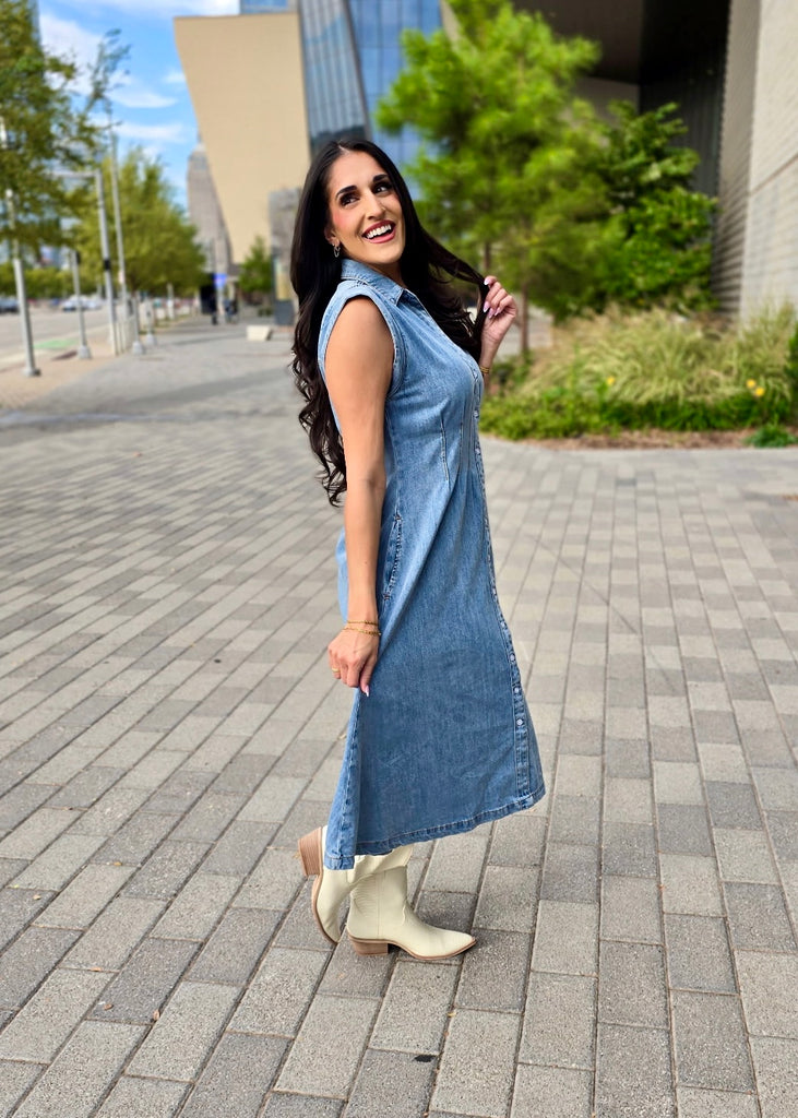 Meet your new closet hero: the Favorite Find Sleeveless Denim Midi Dress. This playful piece features a flattering cinched waist, a chic V-neck with a classic collar, and easy button-up front. Perfect for fall, it's a versatile staple that pairs effortlessly with boots or sneakers for a look that’s equal parts cool and comfy.