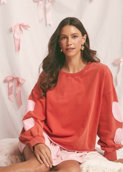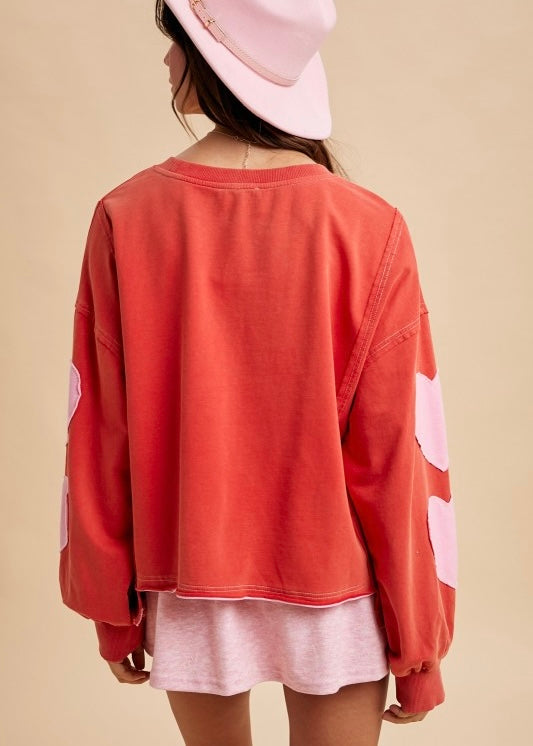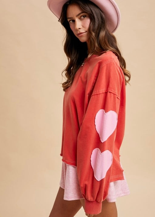 Wear your heart on your sleeve—literally! This adorable sweatshirt features charming light pink heart patches cascading down both sleeves, perfect for showing off your softer side. The mineral-washed red fabric gives it that effortlessly cool, lived-in vibe, while the loose fit keeps things comfy and casual. Raw hem details add an edgy touch that balances the sweetness of those hearts. Lightweight and perfect for layering, this round-neck beauty is your new go-to for looking cute without trying too hard.