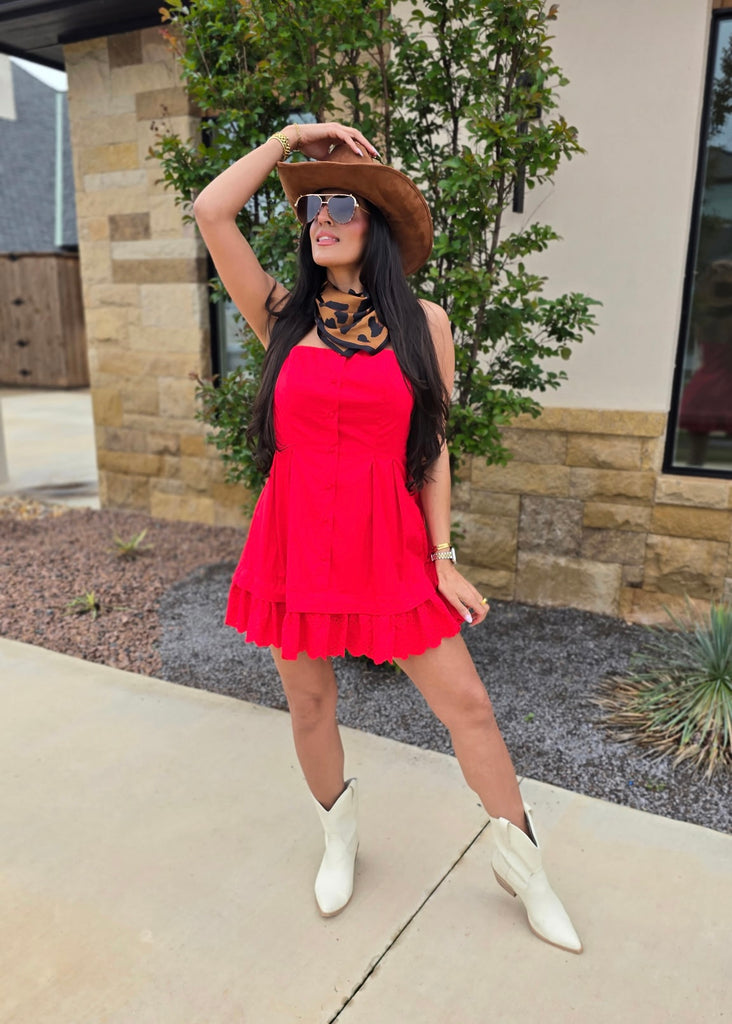 Turn heads in this vibrant red poplin mini dress. The sleeveless silhouette features adjustable straps for a custom fit, while the front faux button-up detail adds playful charm. A convenient side zip closure makes dressing effortless. Lightweight and stretchy fabric moves with you, perfect for cheering, photos, and all-day comfort. Pleated design creates flattering movement, and the lace-lined bottom adds a cute finishing touch. Whether you're tailgating or capturing memories, this fun dress delivers style and confidence.