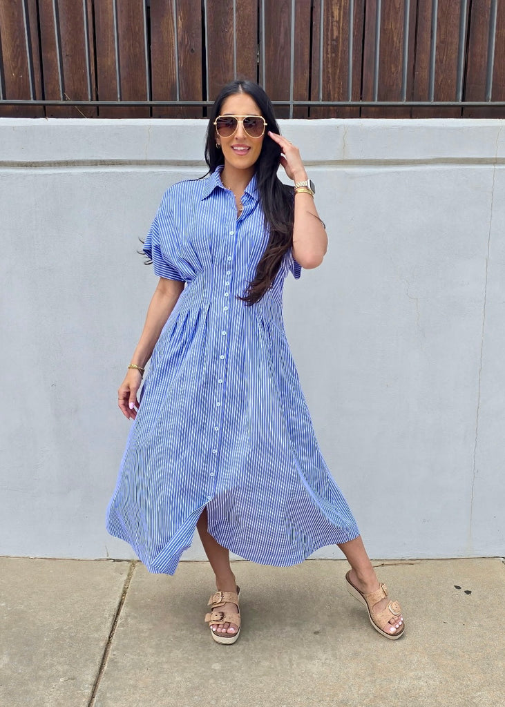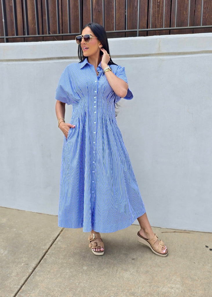 Style meets versatile charm in this blue and white striped midi dress. Featuring relaxed dolman sleeves, a crisp collar, and button-up front, it's designed for those who want easy elegance. The gathered waist with subtle pleating creates a flattering silhouette, while side pockets add practical appeal. Perfect for spring and summer adventures—dress it up for a night out or keep it casual for weekend getaways. Lightweight and breathable, this striped beauty transitions seamlessly from vacation days to everyday wear. Fun, feminine, and endlessly wearable.