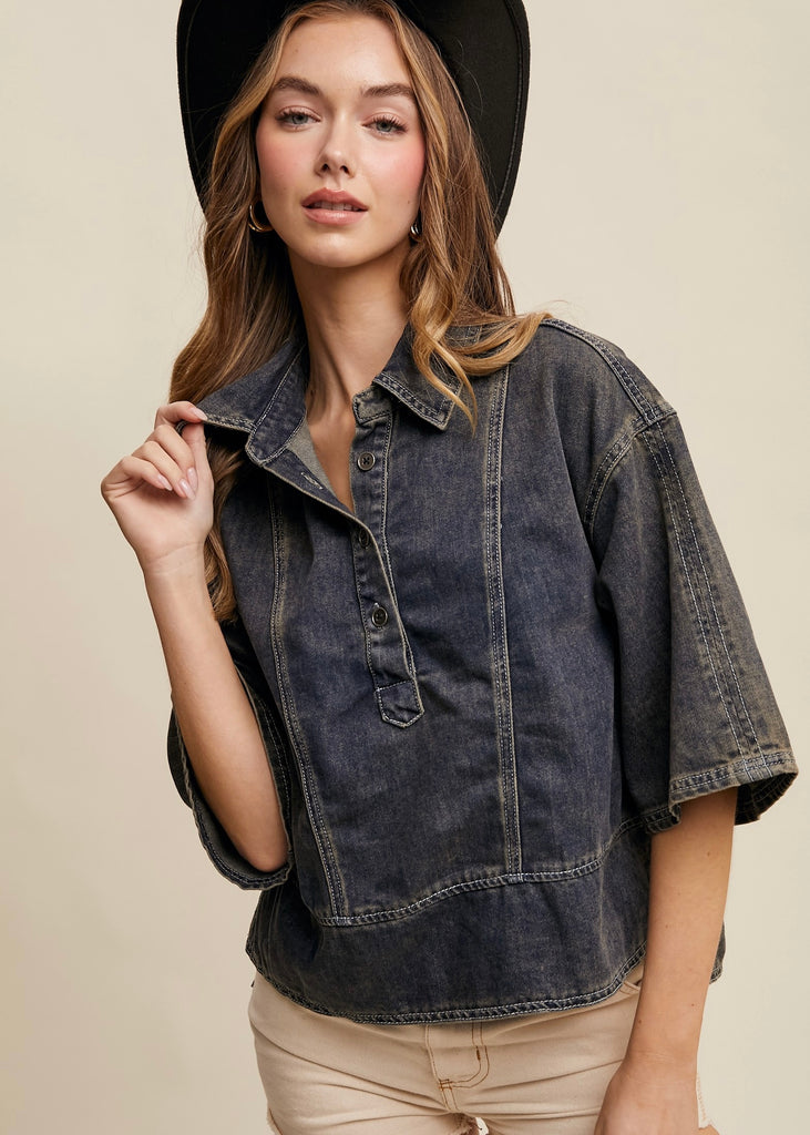 Introducing the shirt that says "I've got my life together" without requiring any actual effort. This denim button-up is your new best friend with its breezy loose fit, drop shoulders, and that sweet spot between short sleeves and three-quarter length. The high-low hem and side slits keep things interesting, while the half-button front lets you show off whatever's underneath. Dark wash denim gets a personality boost from decorative stitching, and the lightweight fabric means you can layer it, tie it, or just throw it on and go. Collared and ready for anything.