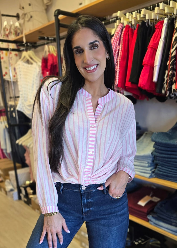 Elevate your spring wardrobe with this charming striped top that effortlessly transitions from season to season. Featuring classic Pinkpi and white stripes, a comfortable button-up front, and long sleeves, it's designed for versatility. The twist front detail at the hem adds a touch of personality, while the longer back hem provides flattering coverage. This piece celebrates your ability to adapt and thrive through every style moment.