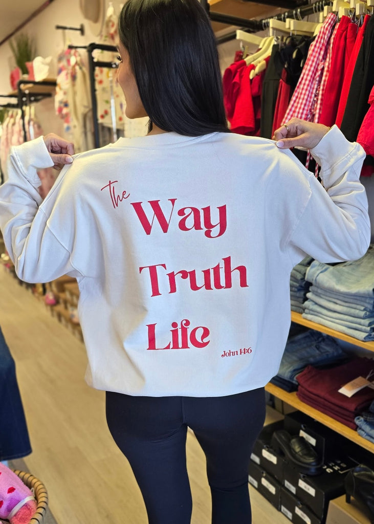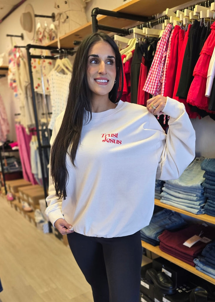 Wrap yourself in faith with this ivory sweatshirt that speaks volumes. The front features "Trust Jesus" in bold red lettering on the left side, while the back proclaims "The Way, The Truth, The Life"—a powerful reminder of your spiritual journey. Perfect for casual wear that doubles as a conversation starter, this comfortable sweatshirt lets your beliefs shine through with style. Whether you're heading to church, running errands, or just keeping it cozy, you'll feel confident and connected to your faith every time you slip it on.