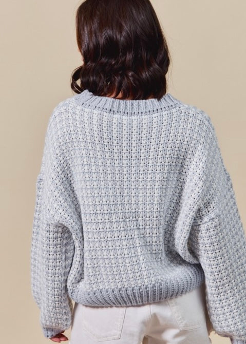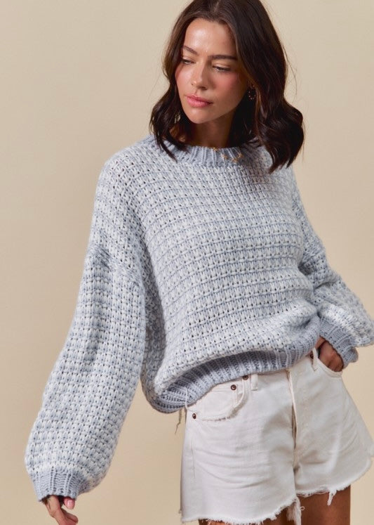 Embrace cozy charm with this delightful light blue and ivory two-tone sweater top. Featuring a round neck and long sleeves, its loose fit and waist-length cut make it perfect for relaxed days with a touch of playful elegance. This sweater adds a soft pop of color and comfort to your casual wardrobe.