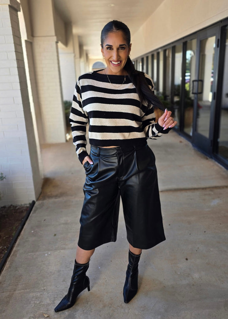 Cozy up in this playful striped sweater that's equal parts chic and comfy. The cream and black stripes keep things classic while the cropped silhouette shows off your style. Long sleeves and a stretchy fabric mean you can move freely, and the boat neckline adds a touch of sophistication. The inside-out hem details give it that effortlessly cool vibe—because sometimes the best fashion moments happen when you break the rules. Perfect for layering or wearing solo.